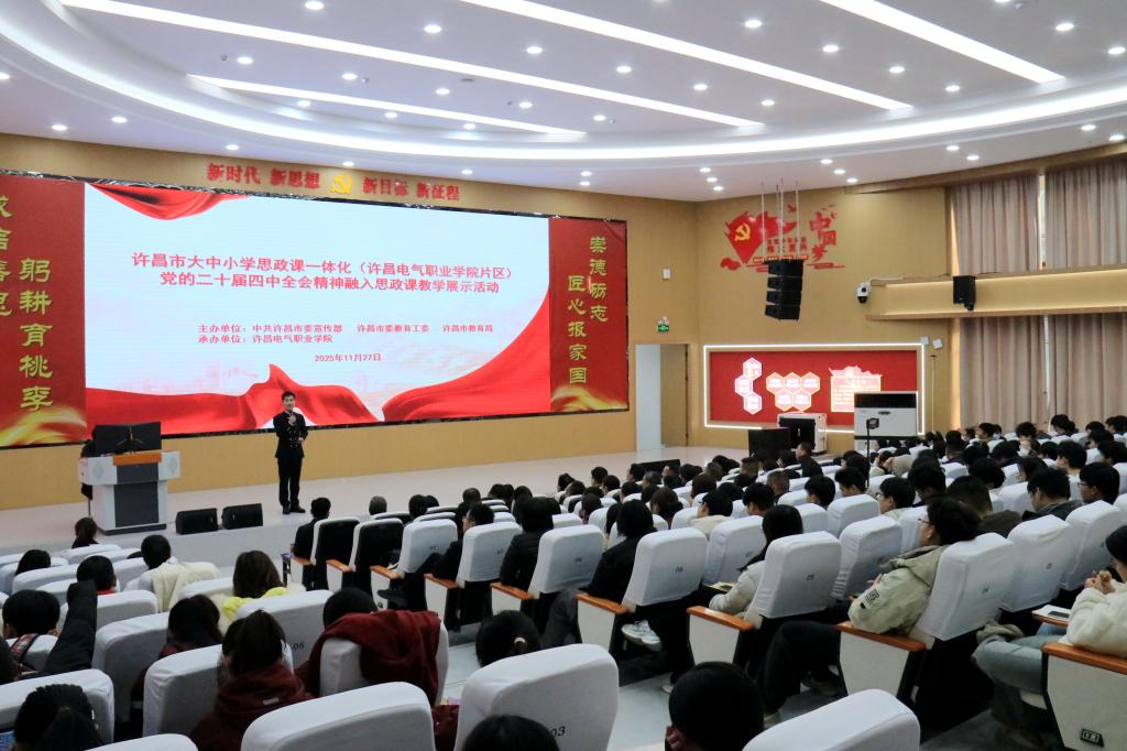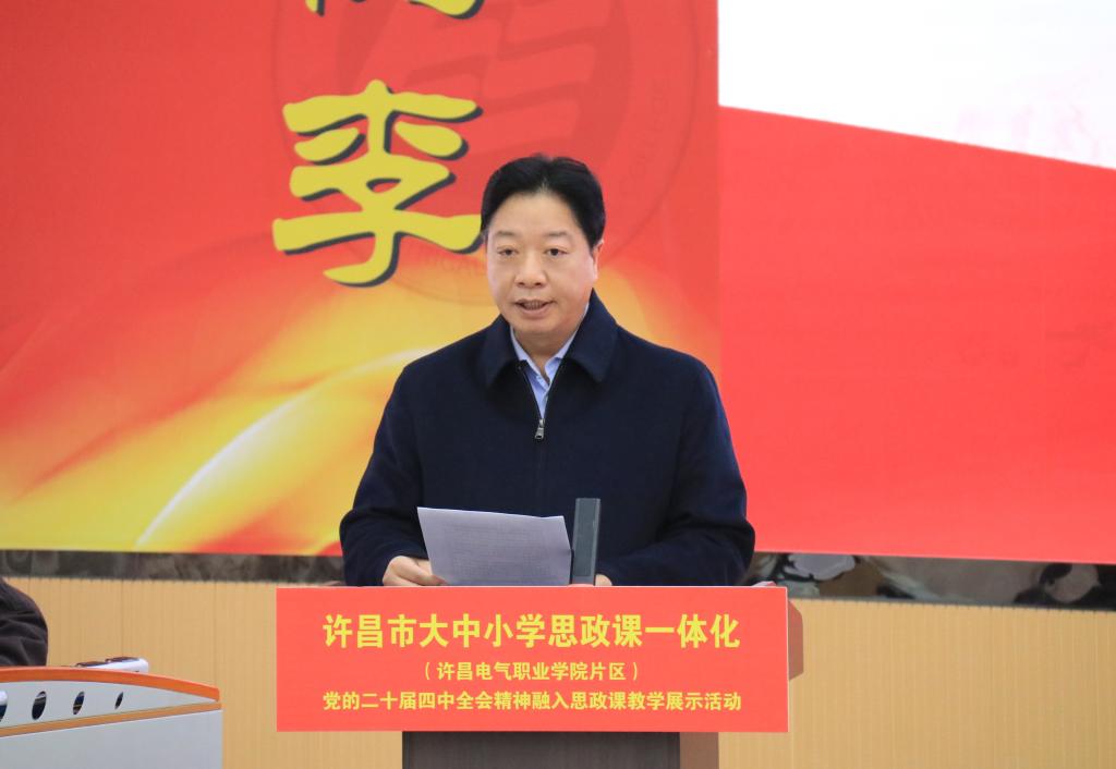 为深入学习贯彻党的二十届四中全会精神,全面落实立德树人根本任务,扎实推进大中小学思政课一体化建设,11月27日,由中共许昌市委宣传部、市委教育工委、市教育局主办,9428cn太阳集团承办的“许昌市大中小学思政课一体化(9428cn太阳集团片区)党的二十届四中全会精神融入思政课教学展示活动”在我集团成功举办。许昌市委常委、宣传部部长赵鹏,9428cn太阳集团党委副书记、院长高远浩,许昌市教育局党组书记、局长刘庆等领导出席活动。各共建单位负责同志、兄弟院校马克思主义学院院长以及来自全市各学段的思政课教师和学生代表共同参与。